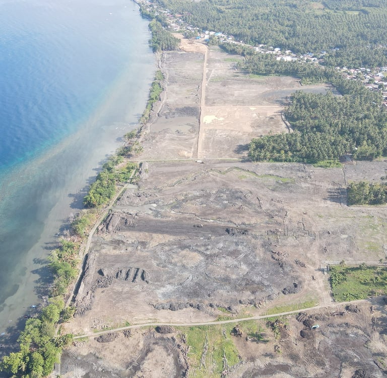 Progres pekerjaan tambak udang modern telah mencapai sekitar 50%, ditandai dengan sebagian petakan tambak yang telah selesai dicetak dan mulai dibentuk sesuai layout desain. Area yang telah dicetak menunjukkan struktur pematang yang rapi dan saluran antar-petak yang mulai terbentuk, mendukung sistem sirkulasi air yang direncanakan. Di sisi lain, pembangunan sarana pendukung telah dimulai, dengan struktur pondasi dan dinding sebagian besar telah berdiri. Aktivitas konstruksi berjalan paralel dengan pemadatan akses jalan utama dan pemasangan saluran outlet .
